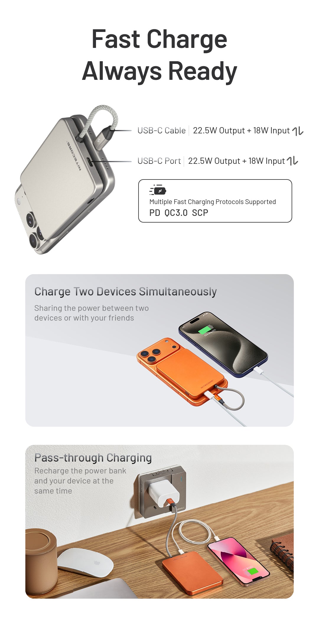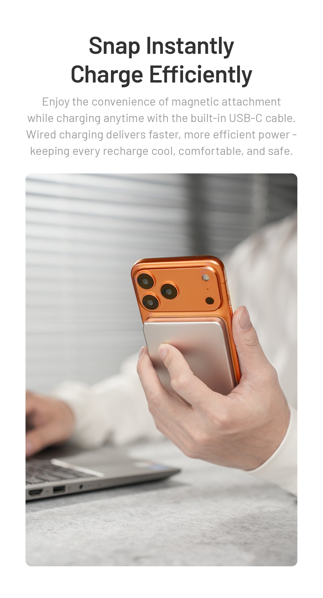 The integrated USB-C cable works alongside the USB-C port, allowing you to charge two devices at once or use pass-through charging to power your phone while recharging the bank itself. Measuring just 0.35 inches thin and weighing only 4.41 oz, the POCKET 5 is slimmer than most magnetic battery packs while remaining powerful and practical. The attached cable secures neatly into its port when not in use, eliminating loose cords and keeping your carry clean and streamlined—snap it on, plug it in, and go.