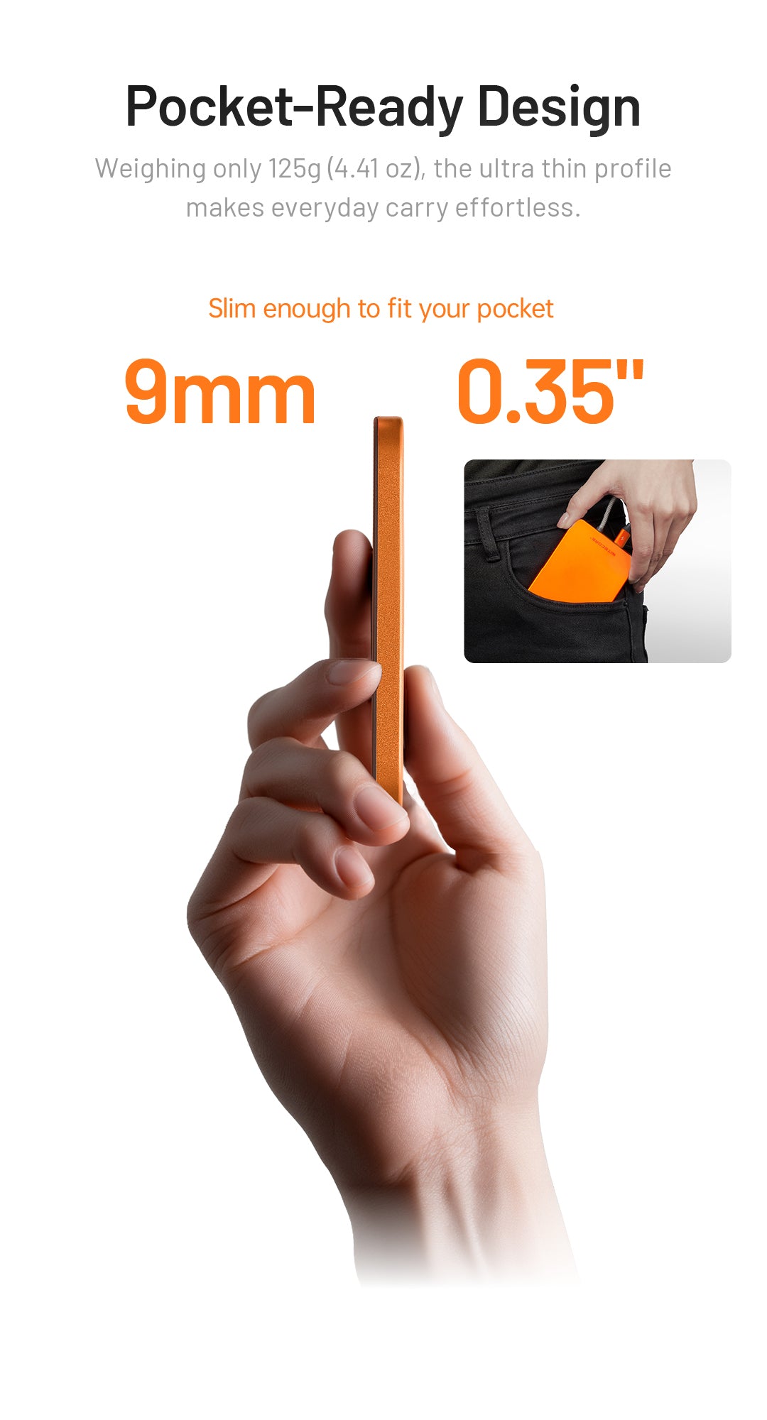 The POCKET 5 Magnetic Built-in USB-C Cable Ultra Thin Pocket Power Bank delivers a 5,000mAh capacity and up to 22.5W output. It features magnetic attachment and an integrated USB-C cable for effortless charging on the go. Weighing just 125g (4.41 oz) and measuring only 9mm (0.35") thin, it fits easily into a pocket or bag, perfect for commuting or outdoor activities.