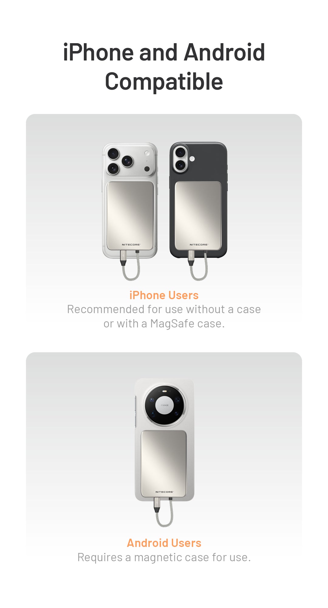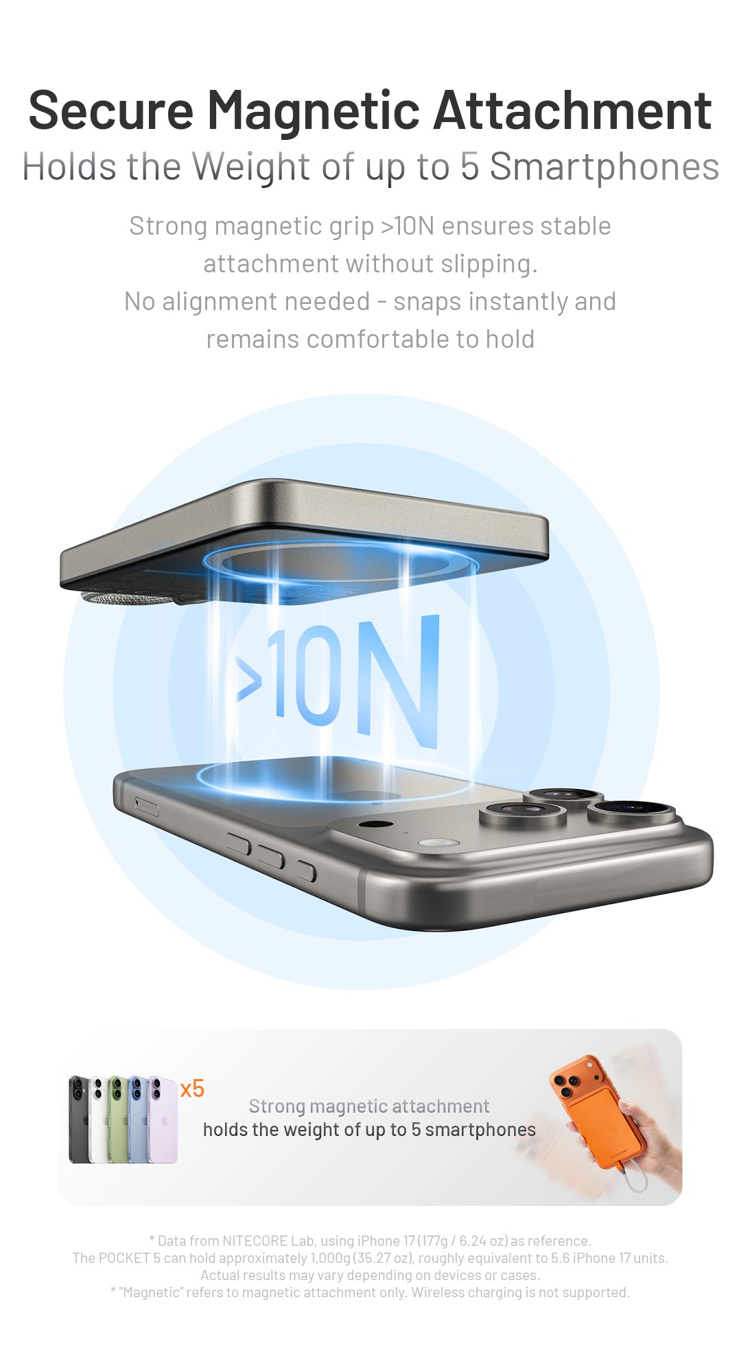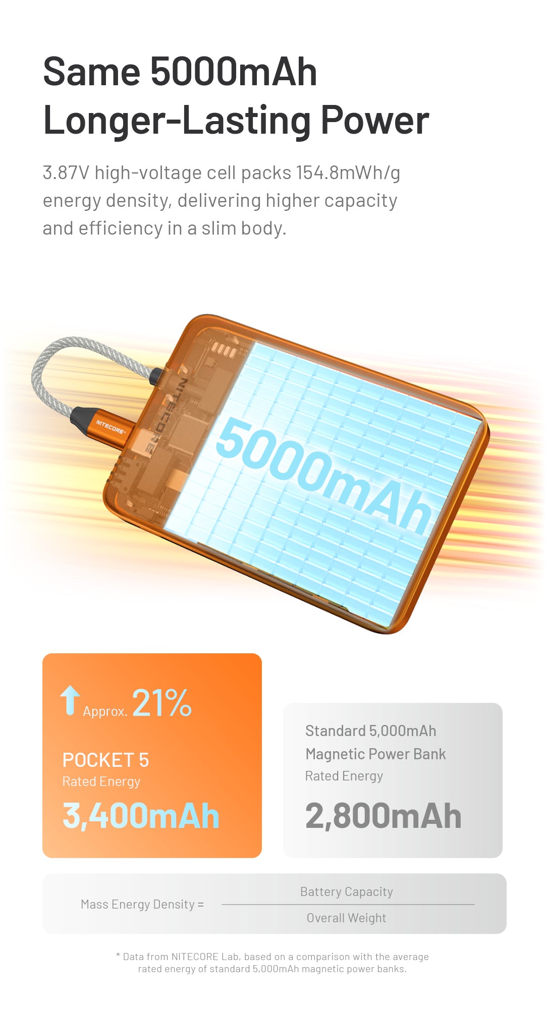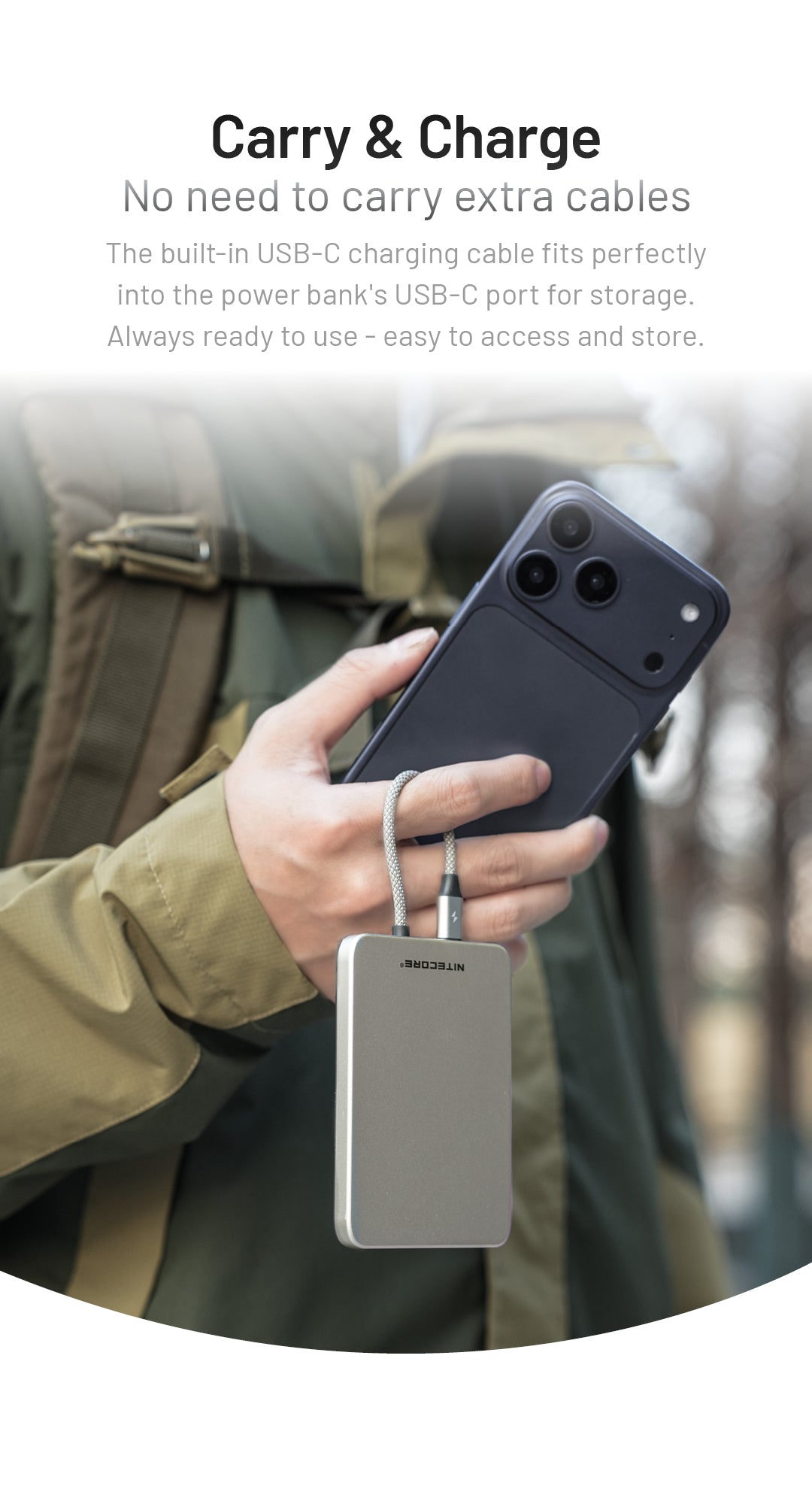 The Nitecore POCKET 5 delivers the convenience of a magnetic power bank with the efficiency of wired charging. It snaps securely onto the back of your phone for a stable, pocket-friendly hold—similar to a wireless battery pack—but instead of relying on slower, heat-generating induction charging, the built-in USB-C cable plugs directly into your device for faster, more efficient power. With up to 22.5W output and a full 5,000mAh capacity, it provides reliable backup to recharge most smartphones and keep you moving throughout the day. *This product is magnetic but does NOT include wireless charging*